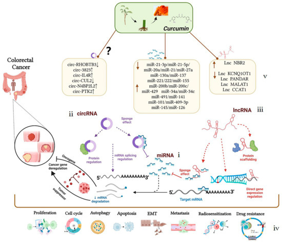Undeniably, more differentially expressed miRNAs, lncRNAs, and circRNAs associated with colorectal cancer need to be further explored. We look forward to more studies on curcumin regulating ncRNAs in colorectal cancer.