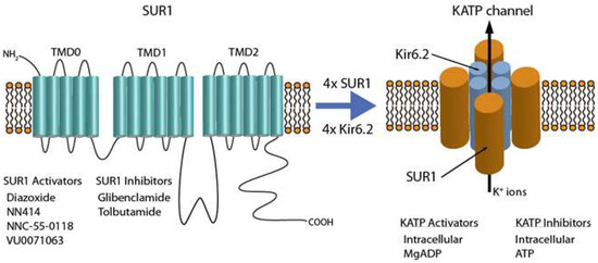 Simplified schematic representation of the SUR1 subunit and KATP channel; key inhibitors and activators of SUR1 listed.