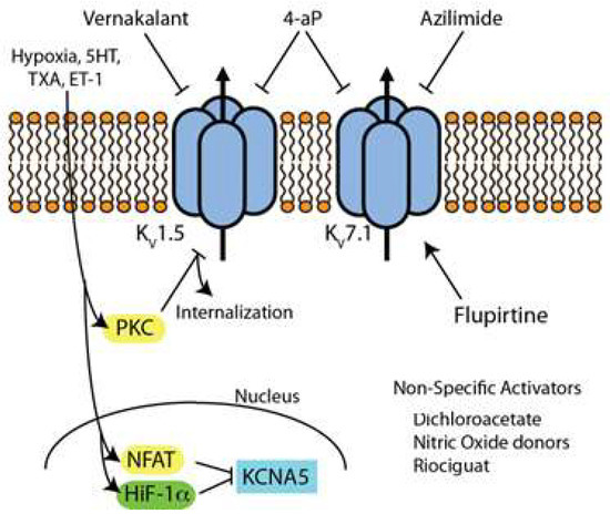 Simplified schematic representation of pathways and small molecules involved in the regulation of the Kv channel; 5HT, serotonin; TXA, thromboxane; ET-1, endothelin-1; PKC, protein kinase C; NFAT, nuclear factor of activated T-cells; HiF-1α, hypoxia-inducible factor-1α, 4-AP, 4-Aminopyridine.
