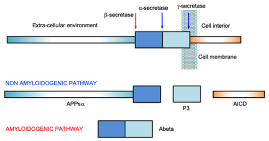 The cleavage of APP is the result of the activity of the enzymes of the secretase family, α- (ADAM), β- (BACE1) and γ- (or Presenilins) secretases, whose sequential intervention results in the onset of the amyloidogenic or non-amyloidogenic pathway (Figure 1).