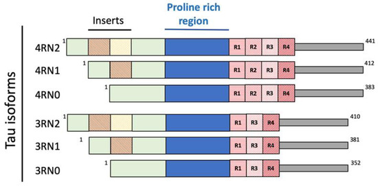 In solution, Tau possesses a harpin-like disordered and unfolded structure [39]. Because of different splicing during human MAPT gene translation, six different isoforms of Tau are present: 3R0N (352 aminoacids, aa.), 3R1N (381 aa.), 3R2N (410 aa.), 4R0N (383 aa.), 4R1N (412 aa.) and 4R2N (441 aa.), depending on the absence (0N) or presence of one (1N) or two (2N) inserts at the N terminus of the protein (Figure 3).