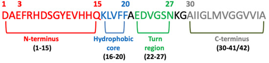 Several studies have confirmed that different Abeta peptide regions contribute in a different way to aggregation and have shed light on several important interactions among specific peptide regions that control this process and are crucial for the peptide’s ability to aggregate and promote neurotoxicity. These regions are: the N-terminus (fragment 1–15) [112], the hydrophobic core (fragments 16–20) [113], the hinge or turn regions (fragments 22–27), [114] and the C-terminus (fragments 31–40/42) [115] (Figure 4).