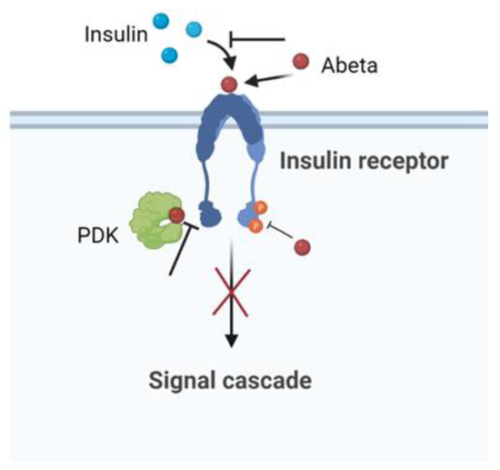 Numerous studies have suggested that insulin resistance is a key risk factor for AD [135,136,137]. Studies showed that peripheral insulin resistance in AD patients was positively correlated with Abeta deposition in the brain [138,139]. In this context, obese patients with insulin resistance have a higher risk of developing AD [1]. Reduced levels of IR and a reduced affinity of the receptor for insulin in the brain have been reported in patients with AD compared to controls [140]. Abeta induced cerebral insulin resistance with effects on insulin signaling by competing, reducing the affinity of insulin binding to its own receptor, or regulating intracellular signalling [141]. The abeta–IR interaction provoked the inhibition of the p-Akt insulin survival pathway. Moreover, in vitro experiments indicated that Abeta interrupted insulin signaling by blocking the association between PDK and Akt [142]. Using cultured hippocampal neurons, the amyloid derived diffusible ligands (ADDLs), that is, the soluble oligomeric forms of Abeta aggregates with the most toxic effect, were found to cause rapid redistribution of IR between the cell body and dendrites. Furthermore, the neuronal response to insulin, measured by the autophosphorylation of IR, was significantly inhibited by the presence of ADDLs. These findings suggested that insulin resistance in the AD brain is a response to Abeta, which disrupted the insulin pathway and caused a brain form of diabetes [143]. The schematic effect of Abeta in inducing impaired neuronal insulin signaling is summarized in Figure 5.