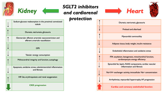 In the kidney, SGLT2-Is act by restoring sodium/fluid homeostasis; they have pleiotropic effects on calcium/phosphate homeostasis, magnesium levels, glomerular tubular feedback, and energy metabolism. In the heart, they modulate the cardiac sodium-hydrogen exchanger. Other effects include systemic metabolic and hemodynamic adjustments, the attenuation of mitochondrial dysfunction, oxidative stress, and inflammation, and the stimulation of autophagy [40].
