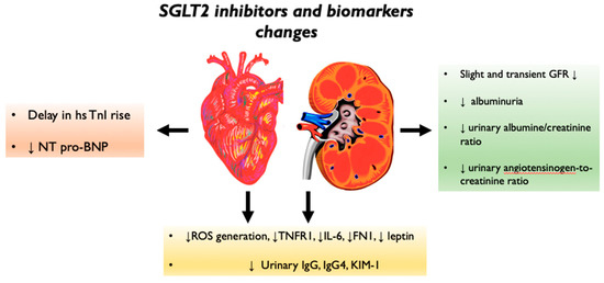 Several biomarkers linked to DKD and HF have been investigated in recent years in humans and animal models after the initiation of therapy with gliflozins (Figure 2).