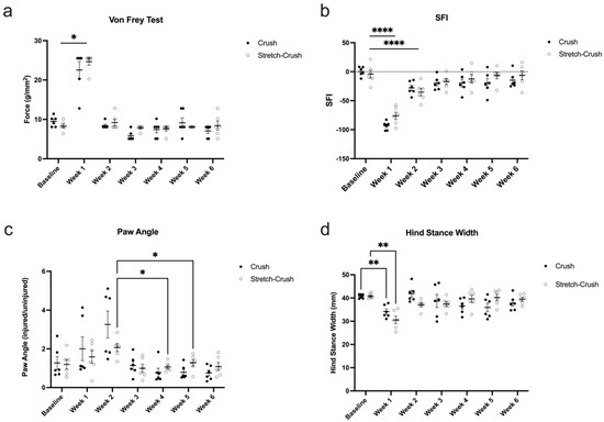 3.2. Behavioral Assessments: Von Frey Monofilament Test, Gait Analysis and SFI