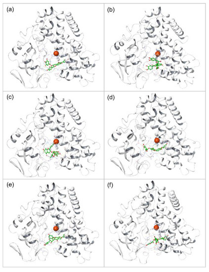 Three-dimensional interaction illustration of protein binding with ligands (a) Catechin 3,7,-Di-O-Galate, (b) Catechin 5,7,-Di-O-Gallatec, (c) Catechin 5,4′-Di-O-Gallate, (d) Epifisetinidol-(4beta->8)-Catechin, (e) Catechin 3-O-Rutinoside, (f) Epicatechin (4b->6) Catechin. (Light Gray->Protein, Green->Ligand, Red ball/blue residue->Heme co-factor).