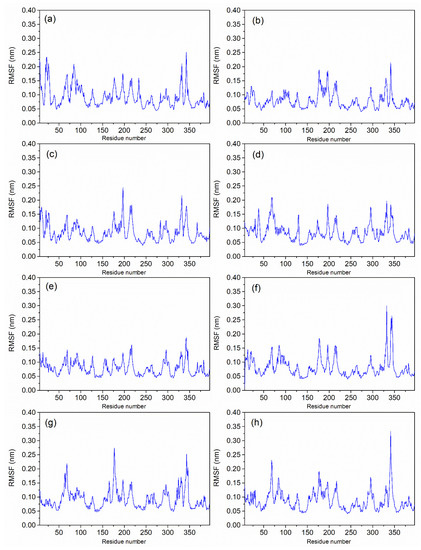 RMSF plots of protein with all ligands (a) Catechin 3,7,-Di-O-Galate, (b) Catechin 5,7,-Di-O-Gallatec, (c) Catechin 5,4′-Di-O-Gallate, (d) Epifisetinidol-(4beta->8)-Catechin, (e) Catechin 3-O-Rutinoside, (f) Epicatechin (4b->6) Catechin, (g) reference L44 inhibitor, and (h) apo-protein.