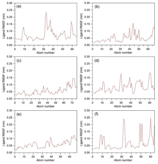 Figure 4 shows the RMSF of each atom of the six ligands complexed with a protein receptor. Even though all the values were under the threshold of 0.3 nm, there were still certain peaks observed, as shown in Figure 4. The compounds 2, 3, 4, and 5, shown in Figure 4b–d,e, did not show any RMSF over 0.2 nm. However, in compounds 1 and 6, shown in Figure 4a,f, there were certain atoms detected that showed RMSFs greater than 0.2 nm. In compound 1, these atoms were O32 and C33, while for compound 6, these atoms were H60, O32, C33, H64, H49, and H51. Overall, none of the atoms in any hit compound showed any significant fluctuations by comparison to the reference L44 inhibitor (Figure S3) and were thus marked for substantial stability with the bacterial protein during the 100 ns MD simulation interval.