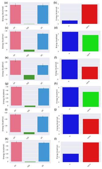 Enthalpy (ΔH), Entropy (TΔS), Binding free energy (ΔG), Interaction Entropy (IE), and Sigma (standard deviation of the interaction energy) values for compounds (a,b) Catechin 3,7,-Di-O-Galate, (c,d) Catechin 5,7,-Di-O-Gallate, (e,f) Catechin 5,4′-Di-O-Gallate, (g,h) Epifisetinidol-(4beta->8)-Catechin, (i,j) Catechin 3-O-Rutinoside, (k,l) Epicatechin (4b->6) Catechin complex with CYP121 protein.