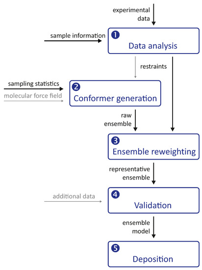 It is important to note that the third stage always yields an ensemble model, even if the experimental data are insufficient or inconsistent. The model must therefore be validated in the fourth stage of the pipeline, for example by systematically omitting restraints in bootstrapping or jacknife resampling [18] approaches. Alternatively, the model can be used to predict previously unused restraints or the outcome of new biophysical or biochemical experiments. Validation may also include visual inspection of the conformers and their interpretation in terms of the biological function of the system.