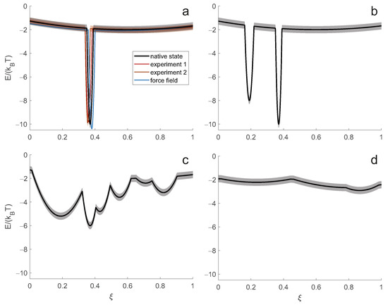 Figure 2. Classification of energy landscapes of biomolecular systems. Energy landscapes are associated with uncertainties (semitransparent bands), as explained in the text. (a) Anfinsen limit with a single minimum several times the thermal energy k B T lower than the rest of the hypersurface. Shown are the slightly different energy landscapes corresponding to the system in the living cell (black), two different experimental series 1 (red) and 2 (orange-red), and a molecular force field (blue). (b) System with two separate minima differing by only a small multiple of k B T . (c) Energy landscape, with ruggedness on the order of k B T . (d) Energy landscape that is nearly flat on the order of k B T .