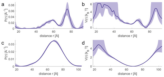 Figure 3. Equivalence between distance distributions (a,c) and potentials of mean force (b,d) for protein site pairs 71/475 (a,b) and 235/475 (c,d) in the complex of polypyrimidine tract binding protein 1 with encephalomyocarditis virus internal ribosome entry site. Data from [31].
