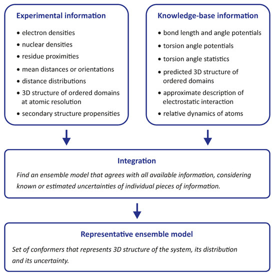 Figure 5. Integration of experimental information and information from knowledge bases into a hybrid ensemble model. The lists of information types for specifying ensembles are examples rather than being exhaustive. The balancing of potentially inconsistent information in the integration step is complicated by partially unknown uncertainty of pieces of information. Construction of a representative ensemble model is complicated by the requirement of separation of uncertainty from natural distribution of 3D structure.