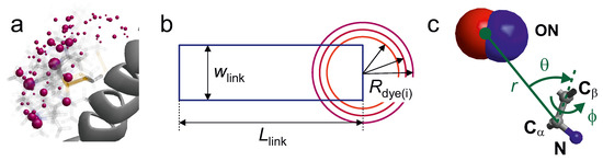 Figure 6. Representation of labels in modelling approaches (a) Rotamer library representation (MMM). Rotamer population is encoded by transparency and by the volume of the purple spheres that represent the N-O group midpoint of rotamers. (b) Accessible volume model parametrized by a linker length L link , a linker width w link , and a set of three dye radii R dye ( i ) . Adapted from [57] (c) Coarse-grained rotamer model based on a dummy ON particle, which represents the midpoint of the N-O group. Each rotamer is defined by a distance r from the C α atom and two angles that relate the label position to the C α -C β bond. Adapted from [62].