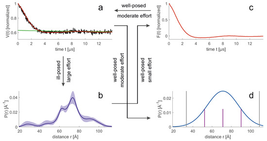 In contrast, computing P (Figure 7b) from V (Figure 7a) [16] is a mathematically ill-posed problem, since the kernel matrix K has a high condition number. Therefore, inversion of K leads to solutions that are unstable even for small deviations of V from the physical model. This problem can be mitigated by representing P by a parametric model with few parameters, by regularization, or by neural network analysis [16]. The simplest model, a single Gaussian (Figure 7d), usually leads to a stable fit, but may suppress significant details of the distribution. In general, converting V to P increases uncertainty compared to converting P to V . Therefore, a direct fit to the primary V data can reduce the uncertainty. This strategy has been used for high-resolution docking of protomers in the dimer of the sodium/proton antiporter NhaA [78] and in high-resolution approaches involving reweighting of rotamer populations [75,76]. With such approaches, a good estimate for the distance distribution is available during background fitting. This allows the use of DEER EPR data with shorter trace length [63,75].