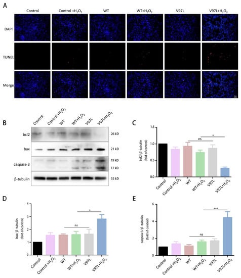 3.3. Effects of HSPB1-p.V97L Mutation on H2O2-Induced Apoptosis in SH-SY5Y Cells