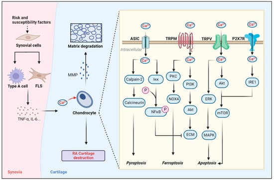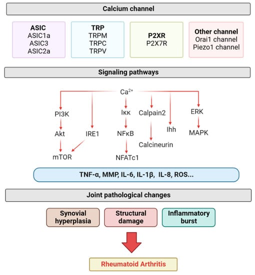 Figure 1. The role of calcium-permeable channels in the pathogenesis of RA. ASIC, TRP, P2X7R, Orai1 and Piezo1 channels regulate a variety of calcium-ion-related signaling pathways, which, in turn, lead to changes in related inflammatory factors, ultimately leading to synovitis, structural damage, and inflammatory outbreaks (created with Biorender.com, access date 29 July 2022).