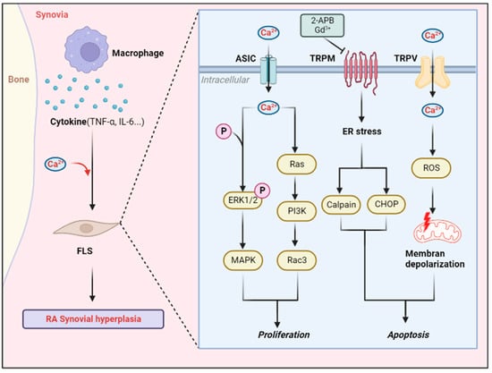 Figure 2. Role of calcium-permeable channel in synovitis. Macrophages can secrete a variety of cytokines to stimulate FLSs in the synovium, leading to a large influx of calcium ions in FLSs cells and triggering related cascade reactions, eventually leading to excessive apoptosis or proliferation of FLSs, and regulating synovial inflammation (created with Biorender.com).