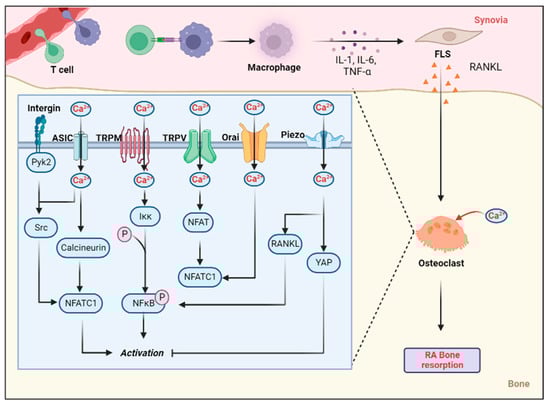 Figure 4. Role of calcium-permeable channel in bone resorption. Synovitis-activated FLS cells can release a number of factors, such as RANKL, leading to an influx of osteoclast calcium ions in the bone. Through signal transmission, this eventually leads to the proliferation and activation of osteoclasts, which intensifies bone resorption (created with Biorender.com).