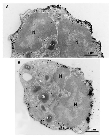- Melo, R.C.N.; Morgan, E.; Monahan-Earley, R.; Dvorak, A.M.; Weller, P.F. Pre-embedding immunogold labeling to optimize protein localization at subcellular compartments and membrane microdomains of leukocytes. Nat. Protoc. 2014, 9, 2382–2394. [Google Scholar] [CrossRef]