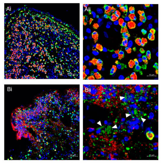 (A,B) Immunofluorescence staining of nasal polyps from patients with chronic rhinosinusitis with nasal polyps. Fluorescence images for MBP (red), galectin-10 (green), and DNA (blue) were obtained using a Carl Zeiss LSM780 confocal microscope, as previously described []. Intact eosinophils are massively infiltrated in polyps (Ai,Aii). The presence of ETotic eosinophils with extracellular traps (degenerated DNA), cell-free granules (punctate MBP), extracellular vesicles (punctate galectin-10), and CLCs (galectin-10-stained needle-like crystals; arrowheads) can be seen (Bi,Bii). Scale bars: 50 μm for (i) and 10 μm for (ii).