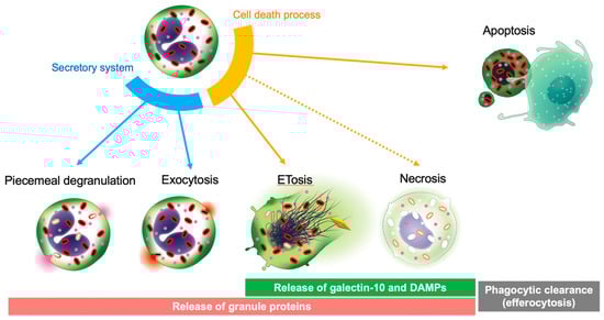 Eosinophil granule-stored proteins can be released quickly without the process of de novo protein synthesis []. Live eosinophils release granular proteins through piecemeal degranulation or exocytosis []. Piecemeal degranulation differentially releases granule proteins, which are transported by discrete, large secretory vesicles []. In contrast, exocytotic degranulation releases the entire granule contents, wherein intracellular granules fuse with the plasma membrane, but this secretory process is not frequently found in vivo. Eosinophils also release their total cellular content through so-called cytolysis, which is distinct from apoptosis and necrosis. Cytolysis in inflamed tissues is associated with deposition of granular proteins and occurs in 30–80% of eosinophils [,,,]. Recent evidence has shown that cytolysis is an active cell death program that releases a net-like chromatin structure (i.e., extracellular trap cell death [ETosis]) [,,,].