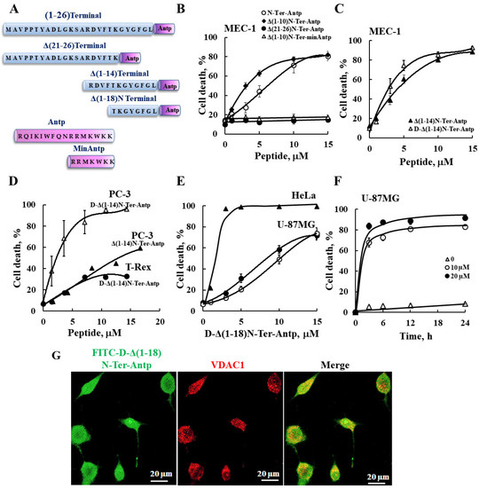 VDAC1-based peptides induced cell death in various cancer cell lines. (A) Schematic illustration of the structure of N-Ter-Antp, Δ(1-14)N-Ter-Antp, Δ(21-26)N-Ter-Antp and Δ(1-18)N-Ter-Antp peptides. The VDAC1-derived sequence N-terminus is shown in blue and the CPP sequence Antp is shown in purple. (B–F) Various cancer cell lines were cultured and incubated with the indicated concentrations of VDAC1-based peptides in the appropriate serum-free growth medium for 6 h at 37 °C, with DMSO at a final concentration of 0.15% in both control and peptide-treated cells followed by analysis of cell death by PI staining and flow cytometry. Data represent mean values ± SE (n = 3). (B) B-cell CLL (MEC-1) were incubated with the indicated concentrations of N-Ter-Antp (○), Δ(1-10)N-Ter-Antp (♦), N-Ter Δ(21-26)-Antp (●), and Δ(1-10)N-Ter-min-Antp (Δ). (C) MEC-1 cells were incubated with the indicated concentrations of Δ(1-14) N-Ter-Antp (▲) and D-Δ(1-14)N-Ter-Antp (Δ) peptides. (D) Human prostate cancer cell line (PC-3) (▲, Δ) and human-transformed primary embryonic kidney fibroblast (T-Rex-293) cells (●) were incubated with the indicated concentrations of D-Δ(1-14) N-Ter-Antp peptide (Δ, ●) or with Δ(1-14) N-Ter-Antp peptide (▲). (E) Human cervix adenocarcinoma (HeLa) (▲) and human glioblastoma (U-87MG) (●, ○) cell lines were incubated 6 h with the indicated concentrations of D-Δ(1-18)N-Ter-Antp peptide and analyzed for cell death PI staining and flow cytometry (o,▲) or FITC–annexin V/PI staining and flow cytometry analysis (●). (F) U-87MG cells were treated with 10 µM (○), 20 µM (●) or without (Δ) of D-Δ(1-18)N-Ter-Antp peptide for the indicated times, and cell death was analyzed by PI staining and flow cytometry. (G) U-87MG cells were incubated for 2 h with FITC-labeled-D-Δ(1-18)N-Ter-Antp peptide (1 mM, green) in serum-free DMEM. Cells were fixed and immuno-stained with anti-VDAC1 antibody (red), and images were captured with a confocal microscope for subcellular localization.
