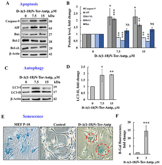 The D-Δ(1-18)N-Ter-Antp peptide induced autophagy and cellular senescence and altered the expression of apoptosis-related proteins. (A,B) U-87MG cells were treated with the indicated concentrations of D-Δ(1-18)N-Ter-Antp peptide for 12 h and then were subjected to immunoblotting for caspase-9, AIF, Bcl-xL, Bcl-2, and Bax and the relative expression level was quantified (B). (C,D) U-87MG cells were treated with the indicated concentrations of D-Δ(1-18)N-Ter-Antp peptide for 12 h and then subjected to immunoblotting for the autophagy markers LC3-I and LC3-II (C) and LC3-II quantification (D). (E,F) U-87MG cells were treated with the indicated concentrations of D-Δ(1-18)N-Ter-Antp peptide for 12 h and then subjected to β-gal activity (blue). Mouse embryonic fibroblast cells at passage 10 (MEF-P10) served as a positive control of senescent cells. Quantification of β-gal staining intensity (F). Data are presented as the mean ± SD, n = 3, * p < 0.05; ** p < 0.01; *** p < 0.001 versus control group. NS, non-specific. The images were captured at 40× and two folds enlargement is shown.