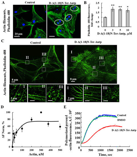 D-Δ(1-18)N-Ter-Antp altered actin filament organization (A,B) U-87MG cells were cultured and incubated for 24 h with D-Δ(1-18)N-Ter-Antp (10 µM). Cells were stained for actin using Phalloidin-488 and visualized by confocal microscopy (A) and quantified for Phalloidin-488 staining intensity (B). The results were from triplicates of different biological repeats and are presented as the means ± SEM. * p ≤ 0.05; ** p ≤ 0.01. (C) Maximum intensity projection of super-resolution (SIM) microscopy image. Selected areas (I–III) were enlarged and presented at the bottom. Scale bars were 2 μm. Images show cell sections close to the basal plasma membrane in order to visualize actin structure. (D) Actin interaction with VDAC1 analyzed using the MST method. Fluorescently-labeled purified VDAC1 (138 nM) was incubated for 30 min at 37 °C with purified actin (10–500 nM) and then, MST was performed. (E) In vitro G-actin polymerization was monitored, as described in the Method section. MgATP–G-actin (2 μM, containing 10% of pyrenyl-labeled actin) was polymerized in the absence (blue line) and presence of 16.7 µM Δ(1-18)N-Ter-Antp peptide (red line) or in the presence of 0.8% DMSO (green line) to a final concentration as in the peptide-containing sample.