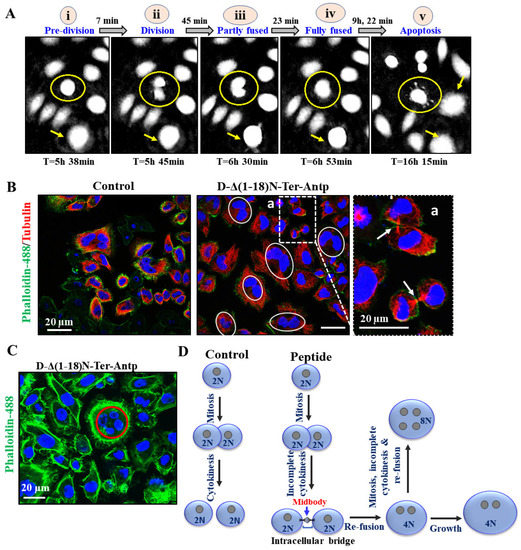 D-Δ(1-18)N-Ter-Antp peptide induced apoptosis and altered cell division. (A) HeLa cells were treated with D-Δ1-18N-Ter-Antp (5 μM, 24 h) and monitored using a live-imaging microscope (HoloMonitor). The time course of cell division is presented. Division–fusion phase times are represented in relation to D-Δ(1-18)N-Ter-Antp administration time (T = 0). i. The cells are in a pre-division stage. ii. The cell divides into two cells. iii. The cell becomes partially fused. iv. The cells become fully fused into one large cell. v. Finally, they become an apoptotic cell. (B,C) HeLa cells incubated with the peptide (10 μM, 24 h) and then stained with anti-tubulin antibodies, followed by secondary anti-mouse-cy3 antibodies (red) followed by actin staining with Phalloidin-488 (green), nuclei stained with DAPI (blue) and visualized by confocal microscopy. Cells with divided nuclei that were connected or in a re-fused state are circled (C). (D) Schematic illustration of cell division phases of control and D-Δ(1-18)N-Ter-Antp peptide-treated cells.