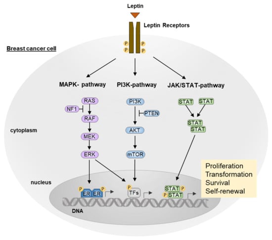 58. Yuan, H.-J.; Sun, K.-W.; Yu, K. Leptin promotes the proliferation and migration of human breast cancer through the extracellular-signal regulated kinase pathway. Mol. Med. Rep. 2013, 9, 350–354. [Google Scholar] [CrossRef]