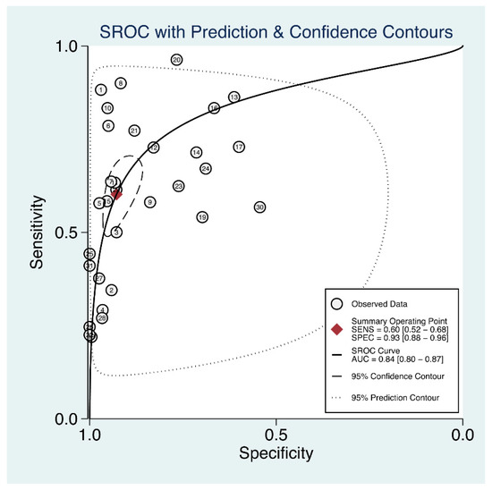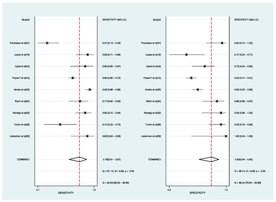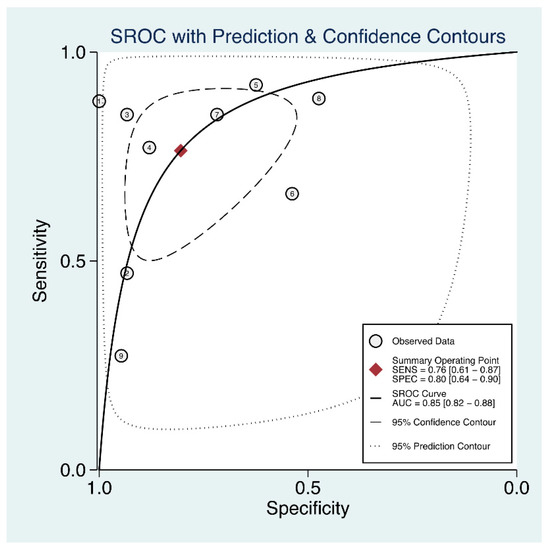 | Sensitivity | Specificity | PLR | NLR | DOR | Area under the Curve (95% CI) | |