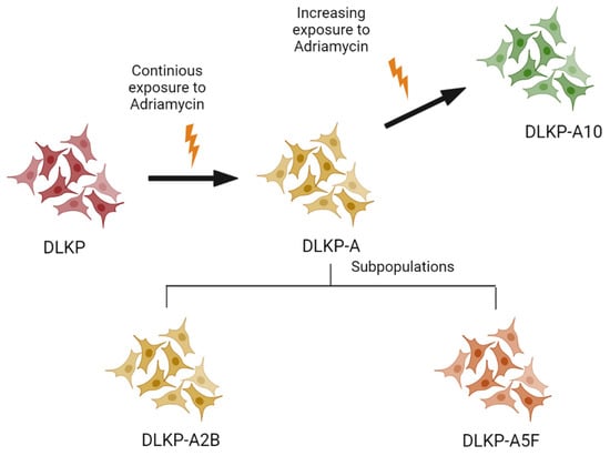 DLKP cells, poorly differentiated squamous carcinoma, were established in the National Institute of Cellular Biotechnology (NICB), Dublin City University (DCU) along with the drug-resistant subpopulations, DLKP-A2B, DLKP-A, DLKP-A5F and DLKP-A10 (Figure 1) [,,,]. DLKP-A was established by continuous exposure of the DLKP cells (pDLKP) to escalating concentrations of Adr (Step 1: 0.05 µg/mL–0.8 µg/mL Adr for 11 months, Step 2: 0.8 µg/mL–1.75 µg/mL for 3 months and Step 3: 1.75 µg/mL–2.1 µg/mL for 3 months) []. Briefly, during these time periods, Adr was added at a concentration which allows 5% survival. When cells were adapted, appeared healthy and reached to confluence, drug concentration was doubled. DLKP-A cell line was observed to have a heterogeneous nature and this was further investigated by Heenan et al. which led to the isolation of drug resistant subclones []. Drug-resistant subclones, DLKP-A2B and DLKP-A5F, which are employed in this study, were isolated randomly from DLKP-A [,]. Briefly, DLKP-A cells were plated on 35 mm tissue culture dishes at the density of 50 cells per dish and grown in 5% CO2 at 37 °C for 24 h. Cells were observed under microscope for singular and dispersed adhesion on the surface and regularly fed with cloning medium (1:1 ratio of mixture of growth medium: conditioned medium (obtained from DLKP-A after 24 h, filtered through 0.2 micron filter and stored at 4 °C)) supplemented with 10% FCS and 1% L-Glutamine. When each single cell formed a colony compromises approximately 50 cells, colonies were separately sub-cultured using cloning rings. The selected colonies were scaled up using 96 well plates, 48 well plates, 24 well plates, 25 cm2 flask and 75 cm2 flasks, respectively. The clones were selected and routinely maintained in culture in the absence of Adr []. The DLKP-A10 variant was established via exposure of DLKP-A cells to increasing concentrations of Adr to a final concentration of 17.25 µM. Once DLKP-A10 was established, cells were cultured in 1:1 ratio of DMEM and DMEM-F12 supplemented with 5%FCS and 1% L-Glutamine in the absence of Adriamycin [].
