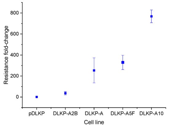 Establishment of drug-resistant cell lines. Resistance levels; pDLKP < DLKP-A2B < DLKP-A < DLKP-A5F < DLKP-A10.