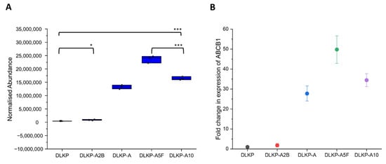ABCC1, also known as MRP1, was the second ABC transporter identified and is associated with the development of drug resistance by glutathione-mediated cellular efflux of chemotherapeutic drugs, leading to poor drug sensitivity []. Its overexpression was previously shown to affect resistance to doxorubicin, etoposide and vincristine. Although ABCB1 and ABCC1 show similar resistance profiles, they exhibit different substrate selectivity. ABCB1 is involved in the transport of lipophilic molecules with a slight positive charge, whereas ABCC1 can transport lipophilic anions and shows specificity to a broad range of substrates such as glutathione conjugates, sulphate conjugates, anticancer drugs, metals, organic anions and lipid analogues [,,]. In this study, ABCC1 was significantly upregulated in DLKP-A (18.8-fold) and DLKP-A10 (5.8-fold), but was not expressed in DLKP-A2B and DLKP-A5F, making the fold change infinite (Supplementary Table S1). However, no correlation was observed between increasing levels of resistance of the DLKP subpopulations and expression levels of ABCC1.