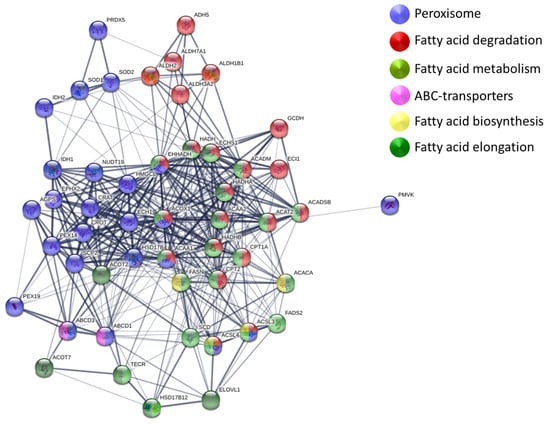 Network of proteins involved in fatty acid metabolism and their interaction with ABC-transporters. Proteins related to various biological processes and protein groups are colour coded as follows: Peroxisome related proteins and ABC-transporters are indicated with purple and pink, respectively. Proteins related to biological processes such as Fatty acid degradation, fatty acid metabolism, fatty acid biosynthesis and fatty acid elongation are indicated with red, green, yellow and dark green, respectively. Protein–protein interactions are shown via grey lines with thickness of the band indicating different strengths of the data support (experiments, data mining, neighbourhood co-occurrence are included to contribute confidence) identified by Gene Ontology analysis. The confidence strength was medium (0.400). (Full DE list and expression details, Supplementary File S1).