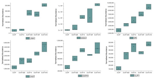 Expression profiles of upregulated membrane proteins in pDLKP and its drug-resistant subpopulations. For DE analysis 3 independent samples per cell line were analysed and normalised abundances of proteins of membrane proteins plotted against cell variant types. LIMA1 (LIM domain and actin-binding protein 1), ANXA1 (Annexin A1), SRI (Sorcin), CAST (Calpastatin), DIAPH1 (Protein Diaphanous Homolog 1), CLIP1 (CAP-Gly domain-containing Linker Protein 1).