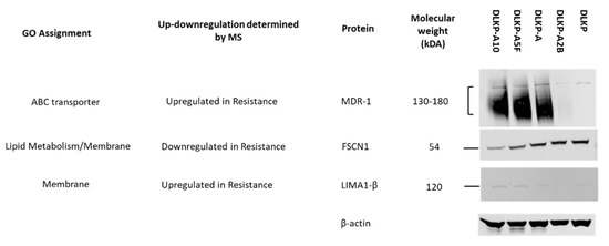 Some of the proteins which shows significant changes in drug resistance cells identified by MS are validated using western-blotting. MS results originates from changes of abundances of proteins at peptide level (Figure 7). In protein level, these changes were observed to be consistent. MDR-1 (ABCB1), which plays important role in the efflux of chemotherapeutic agents from cells, are observed to be highly upregulated in drug resistant subpopulations. A membrane protein, FSCN1, which plays an important role in lipid metabolism is observed to be significantly downregulated in drug resistant cells. Similar to results obtained by MS, highest abundance of this protein observed in DLKP cells, whereas lowest is detected for DLKP-A10. Another membrane protein LIMA1, which plays a role in cholesterol metabolism is determined to be upregulated in drug resistant cells, showing correlation with MS results.