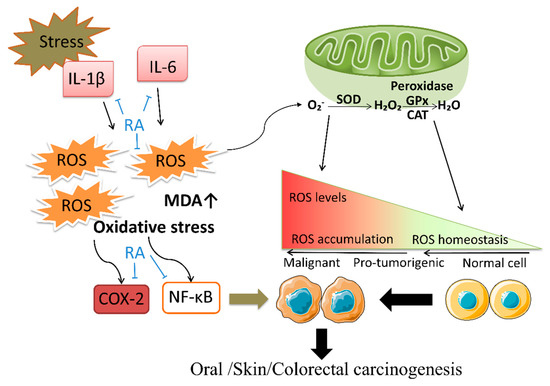 Mechanisms of tumorigenesis prevention effects of RA. When cells undergo oxidative stress or inflammatory factors (ILs), ROS and MDA are accumulated. The intracellular peroxidases SOD dismutate superoxide anion to H2O2, then GPx and CAT catalyze the decomposition of H2O2 into H2O to maintain cellular ROS homeostasis. When cells are continuously stimulated by ROS, accompanied by the activation of NF-κB and COX-2, the normal cells can abnormally proliferate, differentiate, and escape apoptosis, leading to tumorigenesis. RA inhibits the secretion of IL-1β and IL-6, the expression of NF-κB and COX-2, and downregulates the content of ROS and MDA.