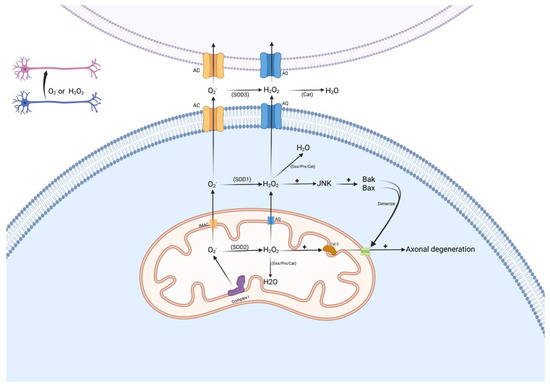 This study has several limitations. First, although it is well known that cellular membranes are relatively permeable to H2O2 and relatively impermeability to , and the basis for the simulations that were used, the degree of permeability to H2O2 also affects the results. However, it is not known what the RGC axonal permeability to H2O2 is in either the unmyelinated or myelinated regions, and assumptions from non-axonal cell membranes may not be incorrect. Second, although the range of concentrations at which H2O2 causes oxidative stress are known [47], there is a lack of experimental data regarding the long-term effects of these concentrations on RGC axons or somas, or the time frame at which they would cause axonal degeneration. The biochemical linkage between oxidatively damaging H2O2 concentrations and mechanisms of axonal degeneration are also unknown.