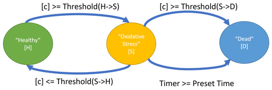 State-dependent ROS production and scavenging rates were assigned to individual voxels: Healthy (H), Oxidative Stress (S) or Dead (D). State changes were dynamic, based on either threshold conditions or triggered by the expiration of timers.