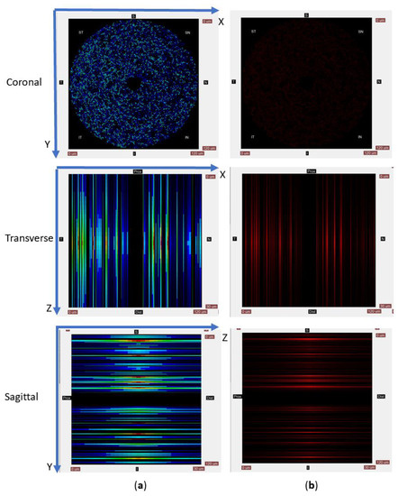 ROS concentrations can be visualized using a heatmap (a) or single-color intensity (b). Sample physical dimensions are mapped to the same number of pixels, resulting in square images even if the sample cut would be a rectangle. In all pictures, black denotes a zero concentration of species. The top of the transverse images represents the model’s proximal side, while the bottom of the image shows the model’s distal side. The transverse view’s left side shows the temporal (T) octant, while the right side of the image corresponds to the nasal (N) octant. In the sagittal views, the picture’s left shows the proximal plane, while the picture’s right shows the distal part. The image top corresponds to the superior (S) octant and the bottom of the image to the inferior (I) octant. Superimposed on the sample is a Cartesian system of coordinates. The coordinate system origin is in the left corner of the coronal plane. The X-axis runs left to right along the top line of the coronal cut, while the Y-axis runs from top to bottom in the same view. Thus, the coronal plane cut displays the XY plane. The Z-axis runs along the proximal to distal direction, with the origin on the axis at the proximal side.