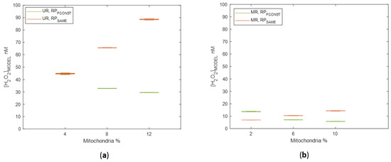 Sample H2O2 concentrations ([H2O2]) depend on mitochondrial volume ratio for ROS production models RPSAME and RPFCONST: (a) Mean H2O2 concentrations for simulations of unmyelinated regions (UR); (b) Mean H2O2 concentrations for simulations of myelinated regions (MR).
