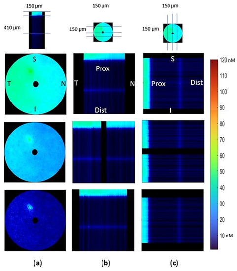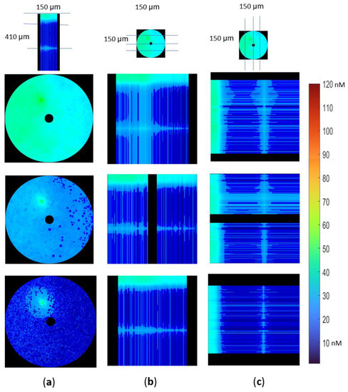 Transverse (Figure 7b and Figure 8b) and sagittal (Figure 7c and Figure 8c) views demonstrate significantly higher gradients along the Z axis than in the XY plane. H2O2 concentrations in the myelinated and the unmyelinated regions were higher than the internodal concentrations when scavenging enzymes were uniformly distributed in the sample (Figure 7b,c).