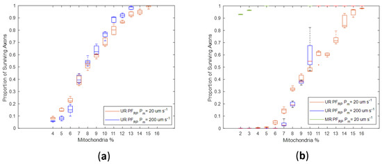 Superoxide is the primary ROS generated by complex I, and its production is increased in LHON cybrids [23,24]. However, is an electrically charged species that does not diffuse through cellular membranes [61] and can be dismutated to H2O2. To test if can explain the zonal loss patterns observed in LHON pathologies, we ran simulations that generated only intra-axonally and did not allow to migrate to the inter-axonal space (i.e., Pm set to 0 µm s−1). We set the concentration threshold at which axonal degeneration would occur to 10−1 nM because reported cellular concentrations of are in the 10−2 nM range [47], and there are no known concentration thresholds that would trigger pathological issues because is rapidly converted to H2O2 in vivo [42]. Given the lack of knowledge about whether stressed axons produced more or less ROS than health axons, we compared the results of simulations where there was increased (PFRP) or decreased (NFRP) production, to check the sensitivity of results to ROS production changes in the Stress state.