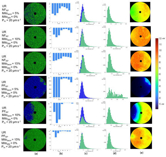 Lack of membrane permeability to ROS species creates evenly distributed zonal loss in the unmyelinated region (UR). NFRP and PFRP simulations have similar end states when the membrane is impermeable: (a) Coronal view of axonal state with healthy axons in green and dead axons in blue; (b) Coronal octant axonal loss is expressed in dB; (c) The distribution of axonal diameters, with green bars representing healthy axons and the blue bars representing the dead axons; (d) Diameter distributions for surviving axons.