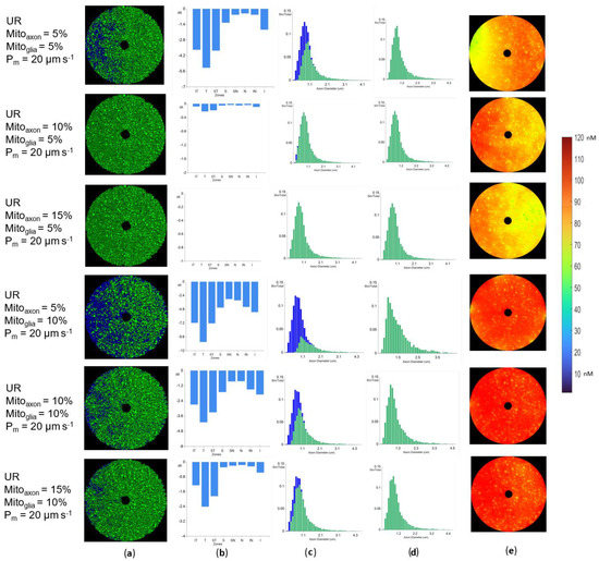 When production uses the constant neuronal firing frequency hypothesis (RPFCONST), axonal loss is heavily correlated with the axonal diameter and skewed towards lower diameter axons. The affected axons demonstrated extreme diameter selectivity (Figure 4c), with smaller axons completely degenerating while larger diameters were unaffected. Thus, optic nerve octants were affected in proportion to their smaller diameter axons. Surviving and dead axons intersperse, with no area of complete axonal loss. The observed patterns differed from actual LHON axonal loss patterns, which show a total loss in large areas, regardless of axonal diameters [16,37].