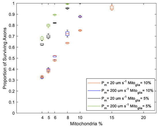 Mitochondrial in glia were placed in the inter-axonal space but without demarcating glial cell boundaries. Each glial mitochondrion could be in one of 3 states (Figure 2), similar to axonal mitochondria. For glial mitochondria, the transition to the [D] state marked the mitochondrial death and cessation of its ROS production.