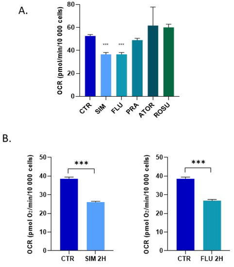 Figure 2. Impact of statins on the oxygen consumption rate (OCR) by prostate cancer cells as measured by Seahorse XF96. (A) effect of a 24 h exposure to five different statins (10 μM) on the OCR of PC-3 cells; (B) effect of a 2 h exposure to simvastatin and fluvastatin (10 μM) on the OCR of PC-3 cells. Bars represent means ± SEM (pmol O2/min/10,000 cells), (***) p < 0.001, one-way ANOVA & Student’s t-test, n = 5.